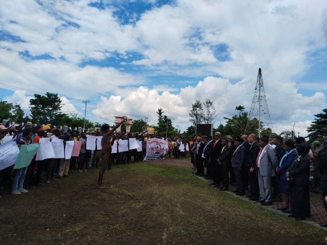 Front Pemilik Hak Ulayat Mimika memblokade halaman Kantor DPRK Mimika dan menuntut ketegasan pemkab mimika untuk menyelesaikan sengketa sengketa tapal batas di wilayah Kapiraya